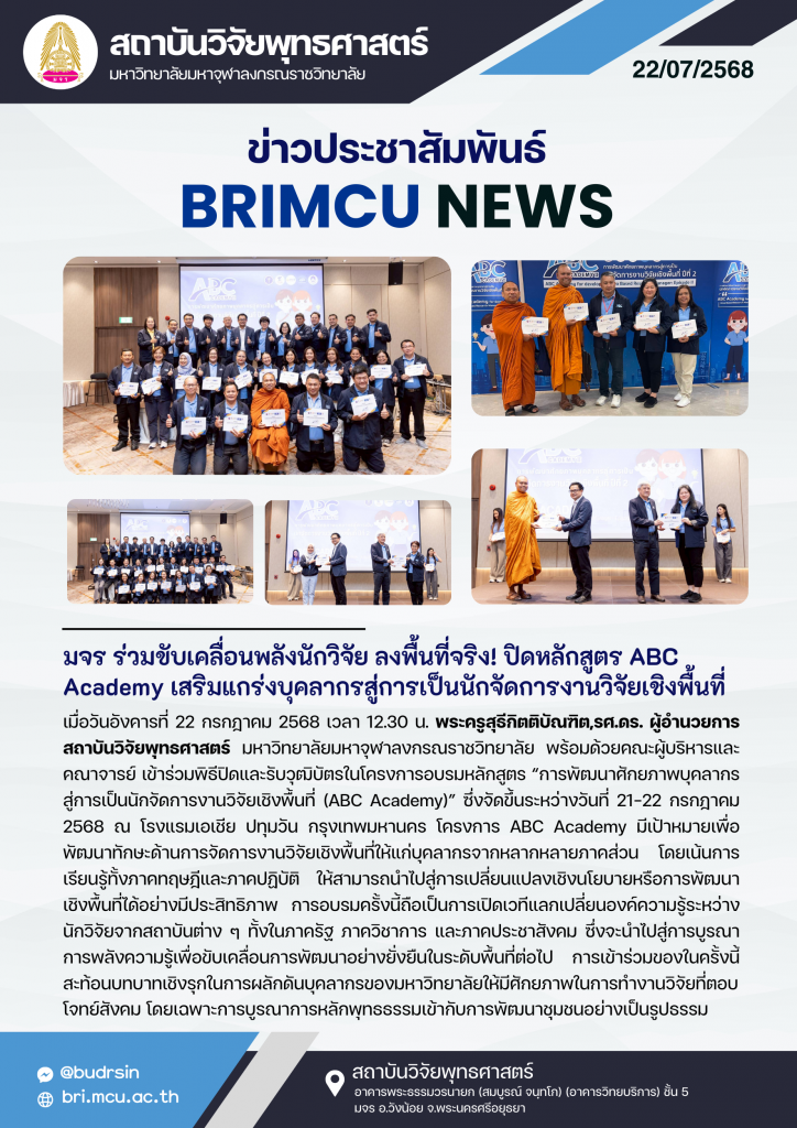 มจร ร่วมขับเคลื่อนพลังนักวิจัย ลงพื้นที่จริง! ปิดหลักสูตร ABC Academy เสริมแกร่งบุคลากรสู่การเป็นนักจัดการงานวิจัยเชิงพื้นที่ ข่าวสารประชาสัมพันธ์ มจร ร่วมขับเคลื่อนพลังนักวิจัย ลงพื้นที่จริง! ปิดหลักสูตร ABC Academy เสริมแกร่งบุคลากรสู่การเป็นนักจัดการงานวิจัยเชิงพื้นที่ Read More »
