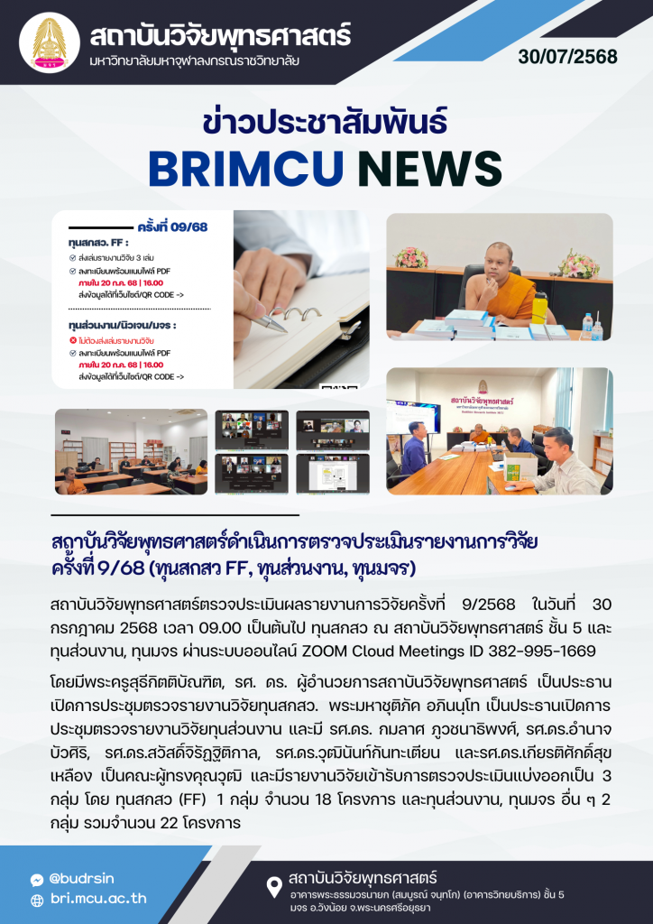 สถาบันวิจัยพุทธศาสตร์ดำเนินการตรวจประเมินรายงานการวิจัย ครั้งที่ 9/68 (ทุนสกสว FF, ทุนส่วนงาน, ทุนมจร) ข่าวสารประชาสัมพันธ์ สถาบันวิจัยพุทธศาสตร์ดำเนินการตรวจประเมินรายงานการวิจัย ครั้งที่ 9/68 (ทุนสกสว FF, ทุนส่วนงาน, ทุนมจร) Read More »